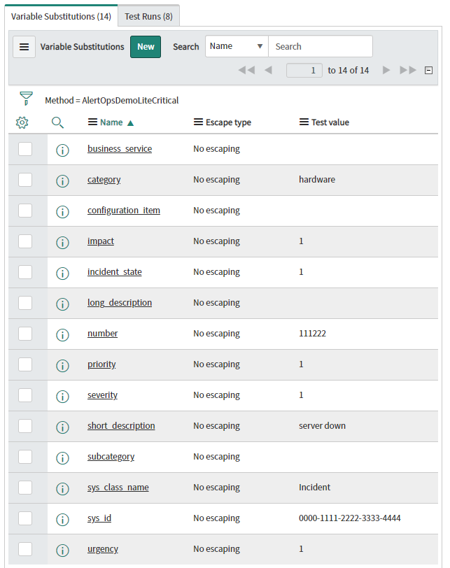 By adding variable substitutions, you will define a test payload to ensure that the REST message can create an alert. Scroll to the bottom of the HTTP method and click New to enter a substitution.