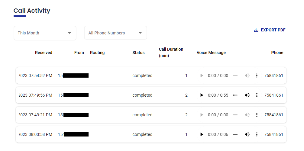 Each attempted transfer is recorded, and time-stamped. Any voicemail can be played from this screen.