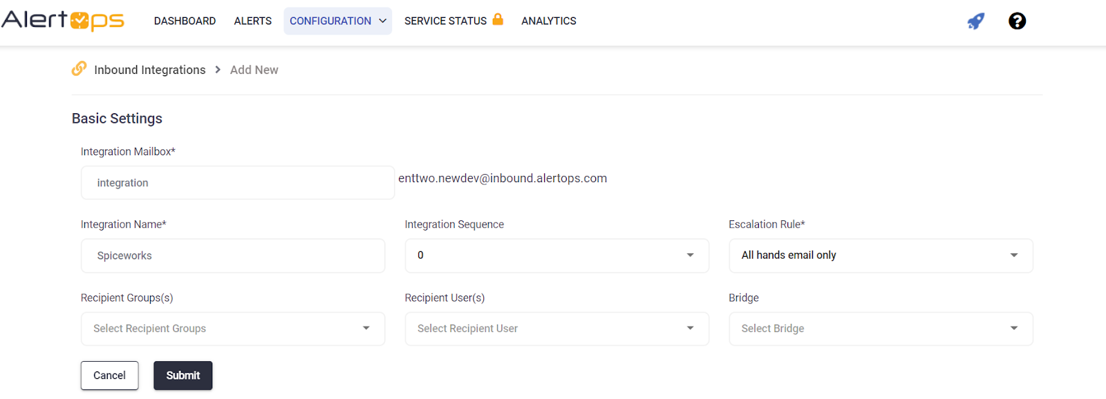 - Enter a name for the Integration. Select an escalation rule to determine the integration's escalation policy.