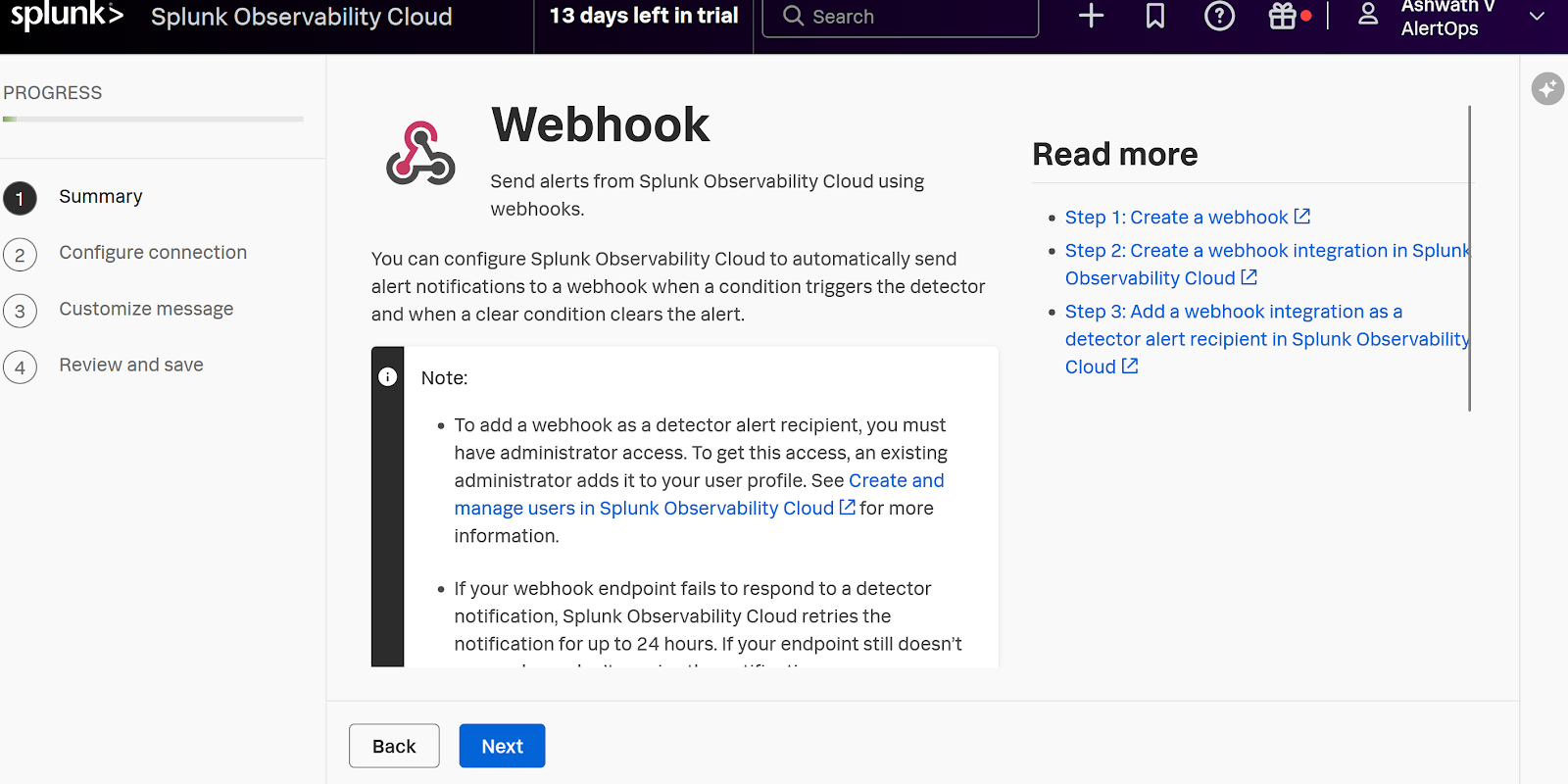 - (Optional) If it is Splunk Observability Cloud: You can choose 'Data Management' > 'Available Integrations' > find 'Webhook'