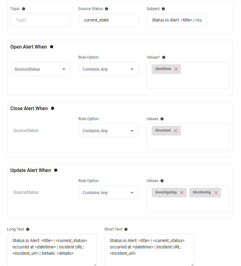 AlertOps will automatically create an incident when a new alert is received from Status.io when the current_state contains "Identified".