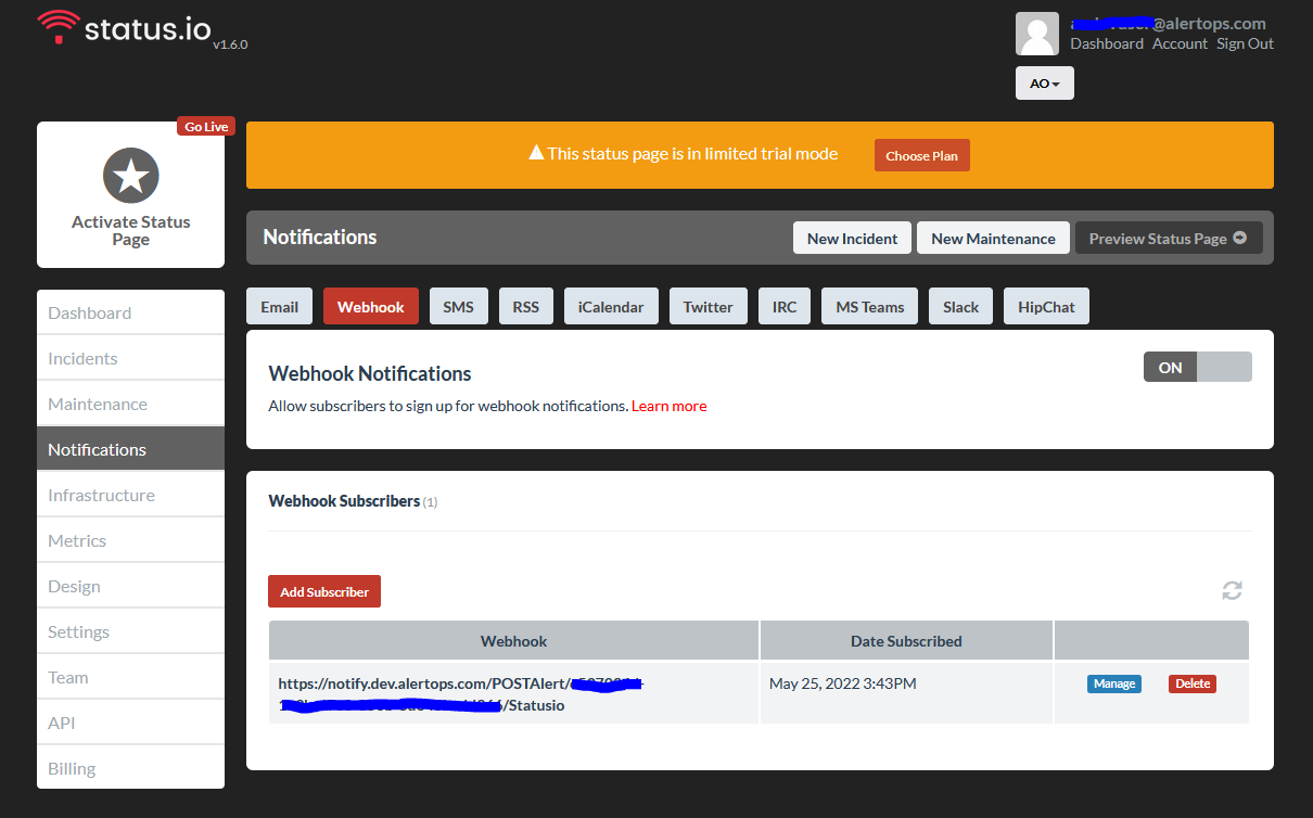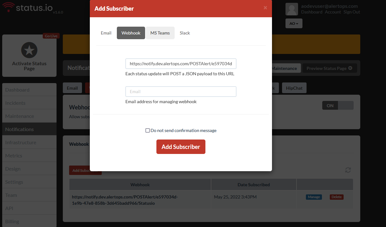- Paste the AlertOps Inbound Integration API URL under the Webhook tab, and provide an email address. Click on Add Subscriber.