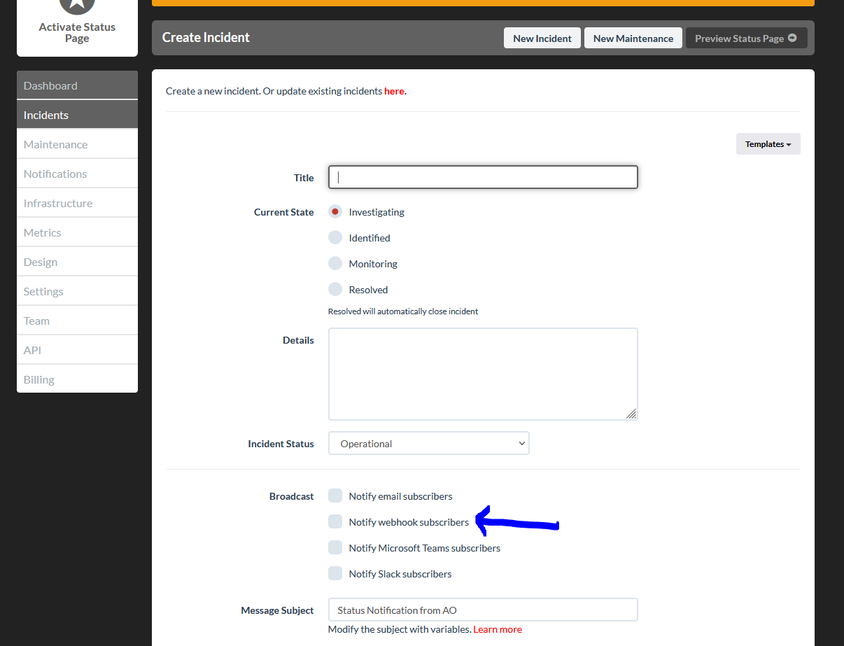 - When creating an Incident, make sure that the 'Notify webhook subscribers' broadcast method is selected.