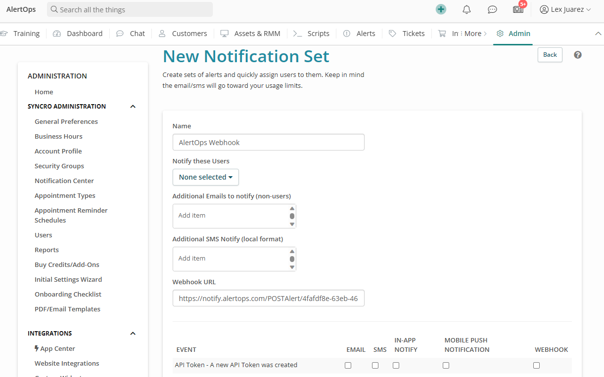 In this section, we will add the webhook in Syncro to send alert data to AlertOps.