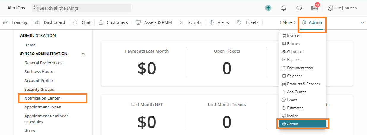- Click Select Admin and select Notification Center from the left menu.