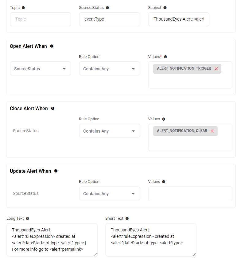 AlertOps will automatically create an incident when a new alert is received from ThousandEyes when the eventType contains "ALERT_NOTIFICATION_TRIGGER".