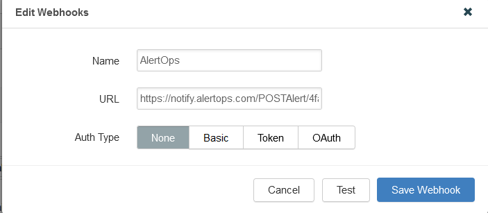 - Give a name, under URL, paste the AlertOps Inbound Integration API URL. Select Auth Type as None. You can test the webhook. Save.