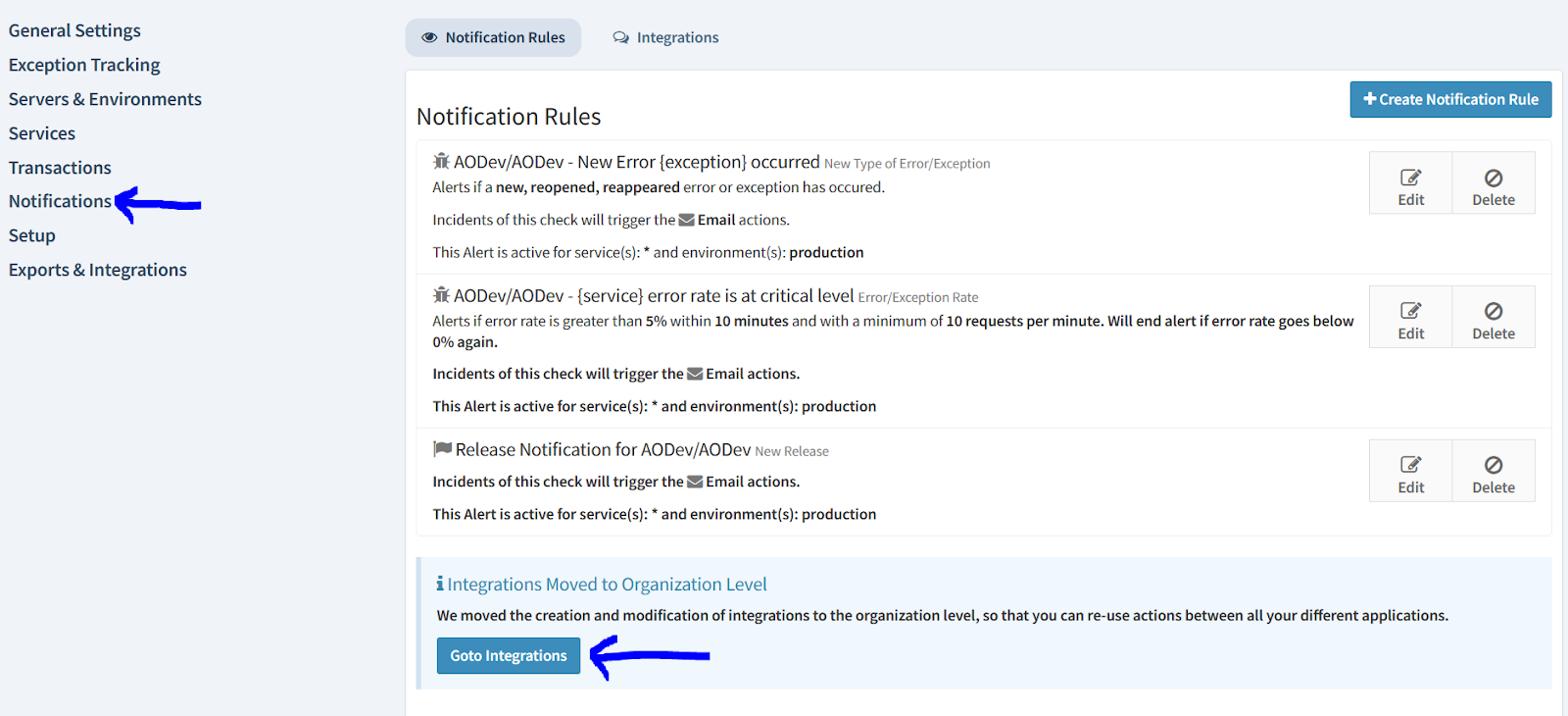 - Go to Notifications. You can create Notification Rules there. Select 'Goto Integrations' below.