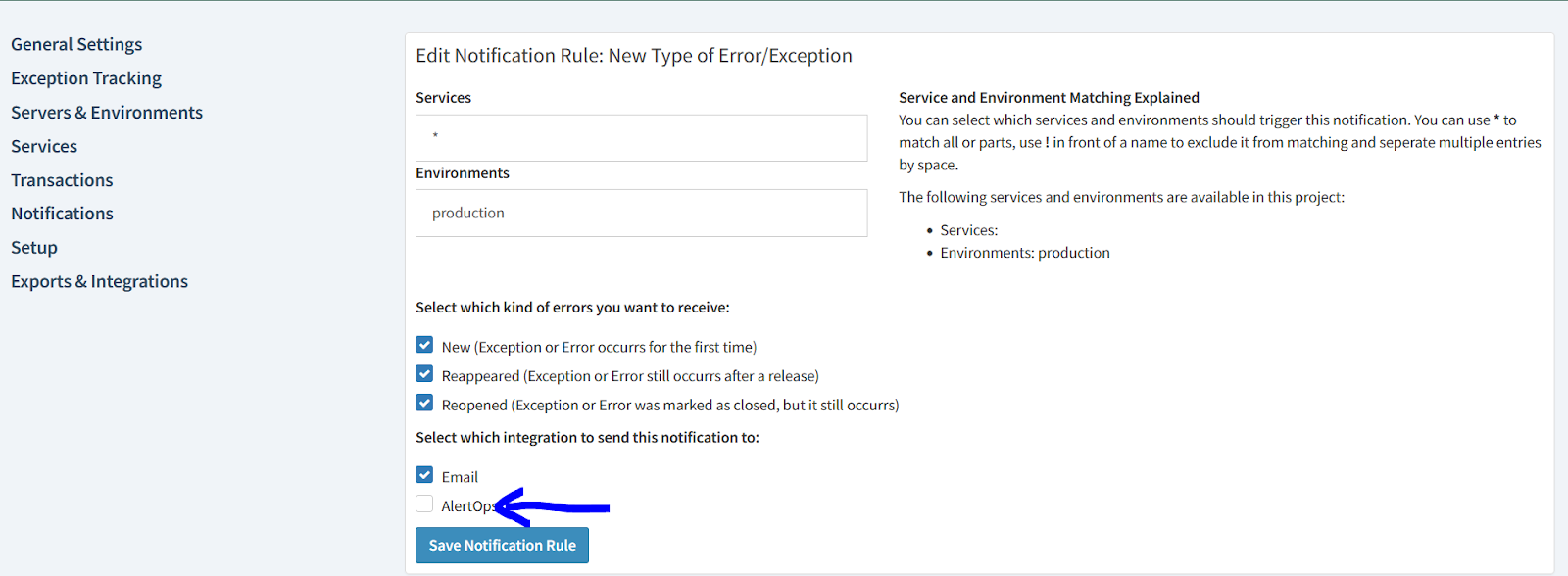 - Make sure that in your Notification Rules, that you created, AlertOps is selected as a notification method.