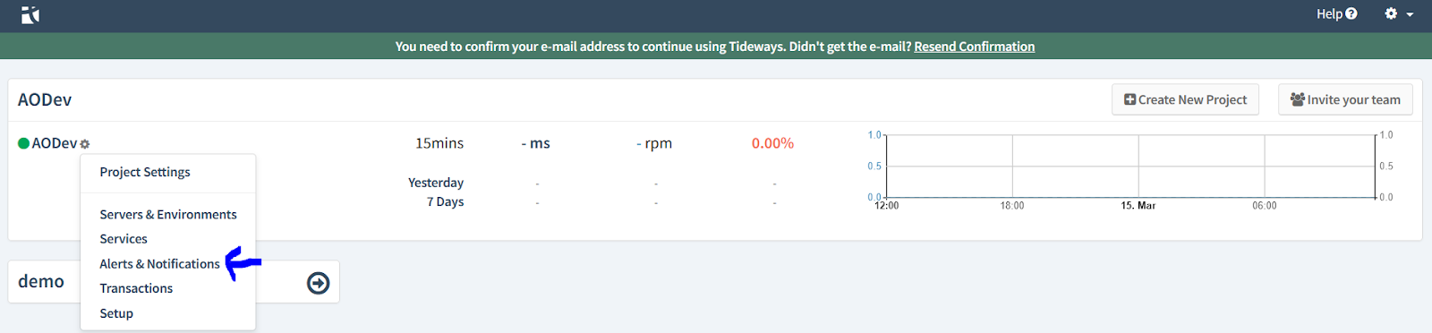 - Right next to the name of your organization project, select the Settings gear icon and then select 'Alerts & Notifications'.