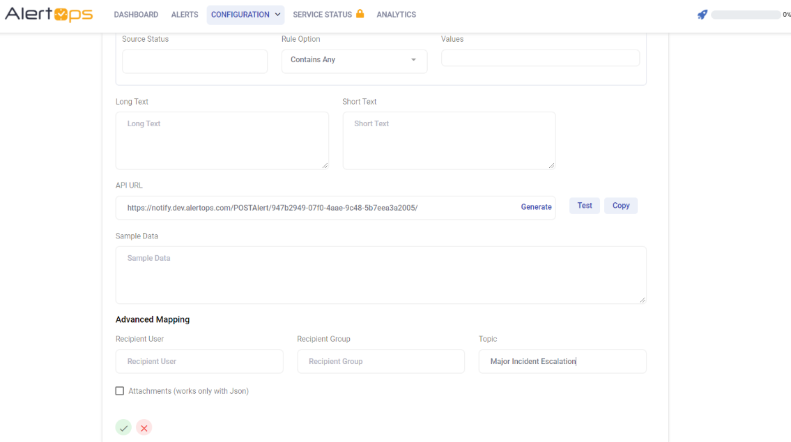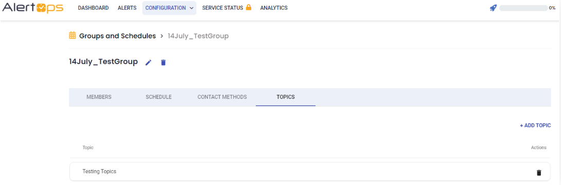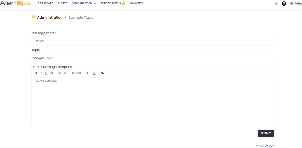 - Select the created Topic from the list and enter Default Message Template (a pre-loaded alert message text) and assign groups to the Topic.