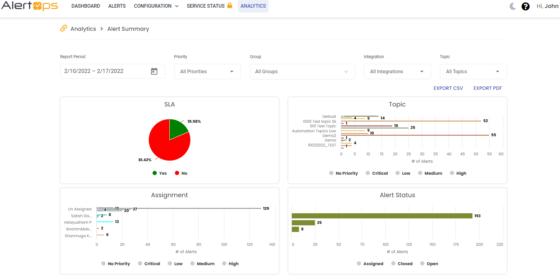 You may track by Topics in the Alert Summary, Alert Trent, and Open Alerts Reports.