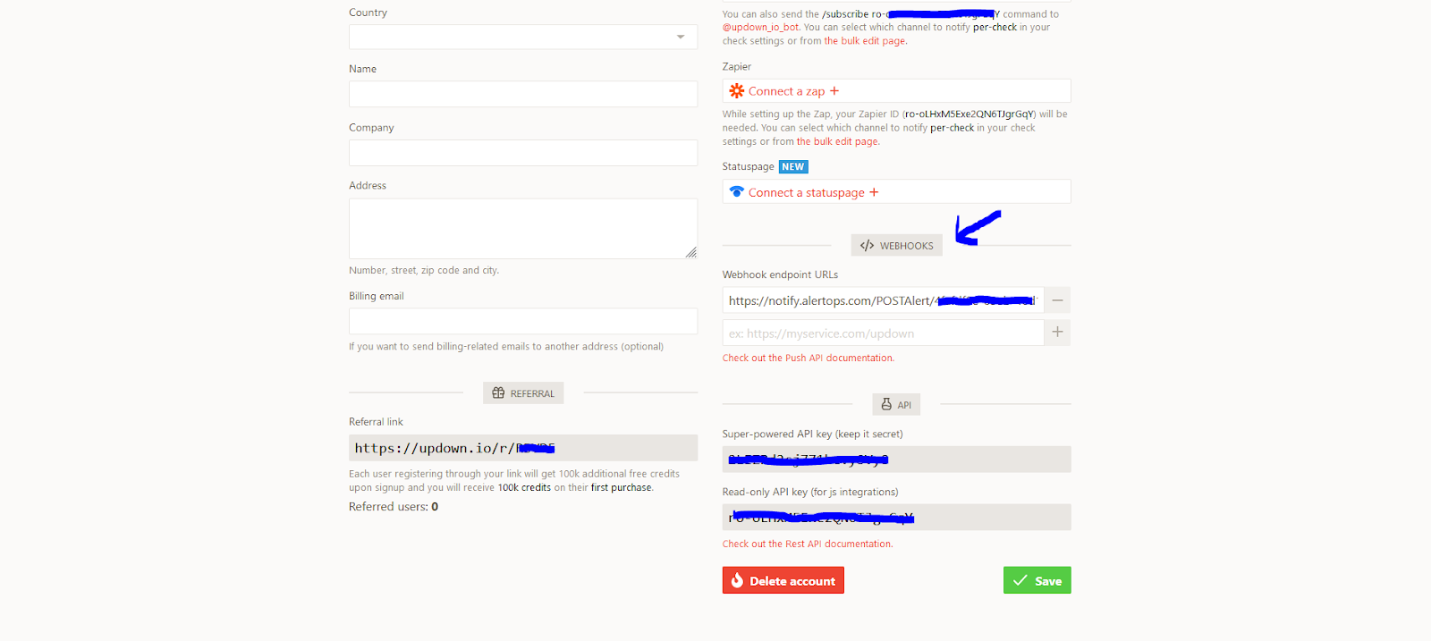 - Make a note of the API URL, which will be used in Updown, so it calls a HTTP POST request to this URL with the body in JSON format containing the alert specific information. AlertOps automatically creates an alert when the status variable (_0^event) contains 'check.down'. The incident will also be closed automatically when the status 'check.up' is received from Updown.io