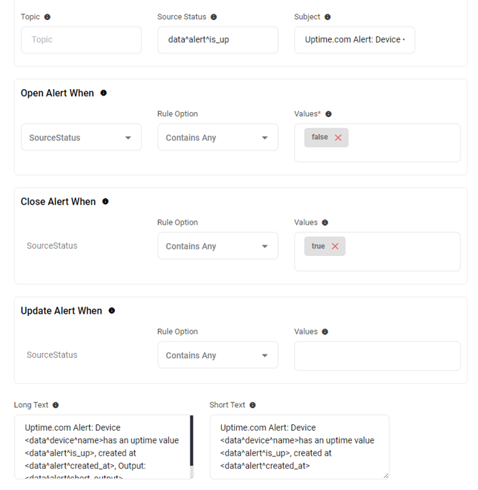 AlertOps will automatically create an incident when a new alert is received from Uptime.com when the data^alert^is_up field contains "false".