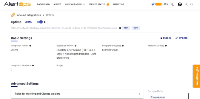 - Once you click save, the API Integration will be created, and you will be given a unique URL which acts as the access point and needs to be configured at the source (in this case Uptime.io), to send alerts. You can find the integration you just created, and you can give advanced settings and define various configurations for the alerts to be received and processed. For example, you can define when to open and close alerts based on the payload obtained from the API call, filters etc.