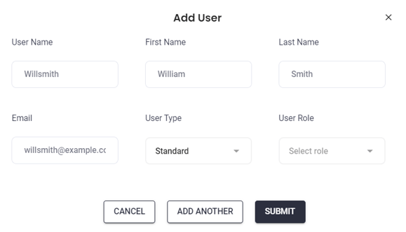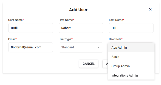 - Select the User Type, by default Standard User is selected. Here you will designate the user type from the 3 choices above.
