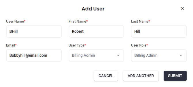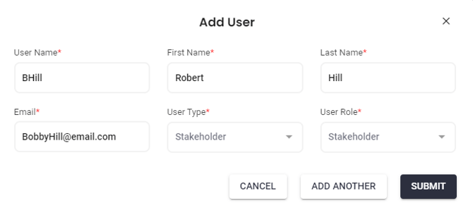 - Select User Role from the dropdown list. For stakeholder and billing you do not have the option to select a user role.