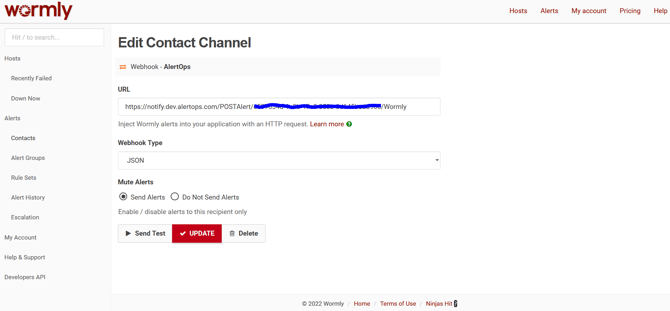 - Make a note of the API URL, which will be used in Wormly, so it calls a HTTP POST request to this URL with the body in JSON format containing the alert specific information. AlertOps automatically creates an alert when the status variable (isrecovery) contains '0'. The incident will also be closed automatically when the status '1' is received from Wormly.