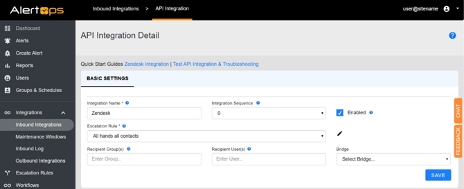 - Enter a name for the integration. Select an escalation rule to determine the integration's escalation policy. And, enter the names of recipient group(s) and recipient user(s). Click 'SAVE.' Then, click 'COPY URL' to copy the URL endpoint to be used in the Zendesk configuration.