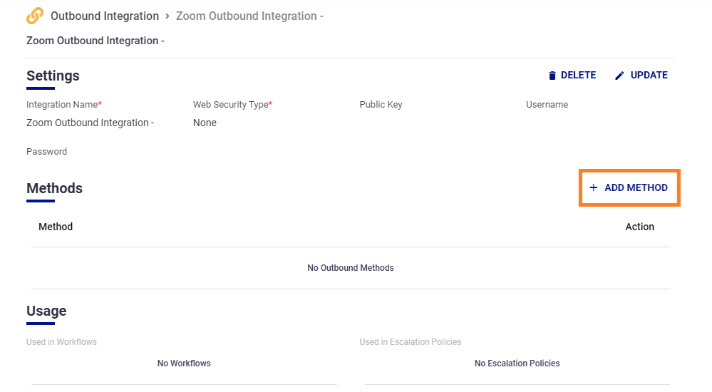 - From the Zoom Outbound Integration page, scroll down to the Methods section and click the Add Method button.