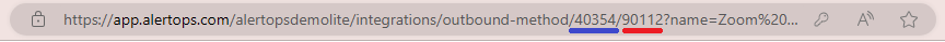 Note: The values for Integration ID(shown below underlined blue) and Method ID(shown below underlined red) can be found in the URL for the Create a Zoom Meeting Method in AlertOps.