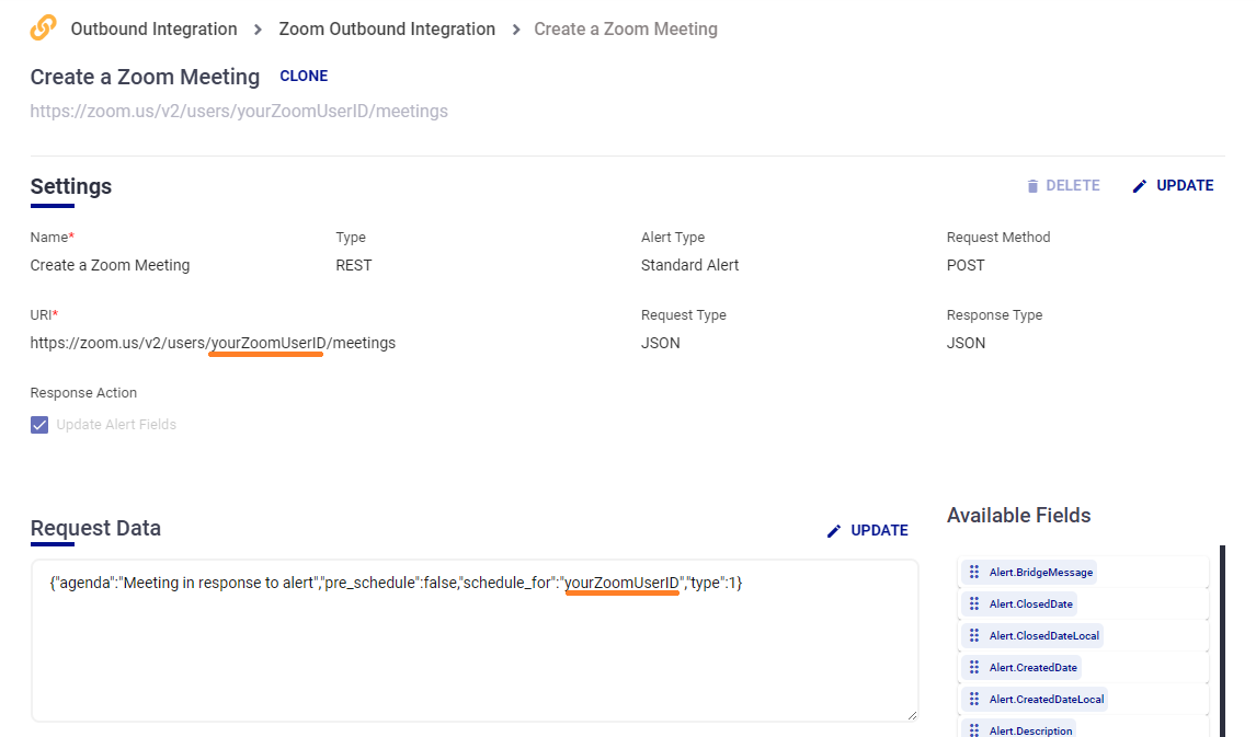 - {"method_name":"Create a Zoom Meeting","is_used":true,"method_type":{"type":"REST","uri":"https://zoom.us/v2/users/yourZoomUserID/meetings","request_type":"JSON","web_method":"POST","response_data_type":"JSON","request_data":"{\"agenda\":\"Meeting in response to alert\",\"pre_schedule\":false,\"schedule_for\":\"yourZoomUserID\",\"type\":1}","response_data":"","headers":"{\"Authorization\":\"Bearer <